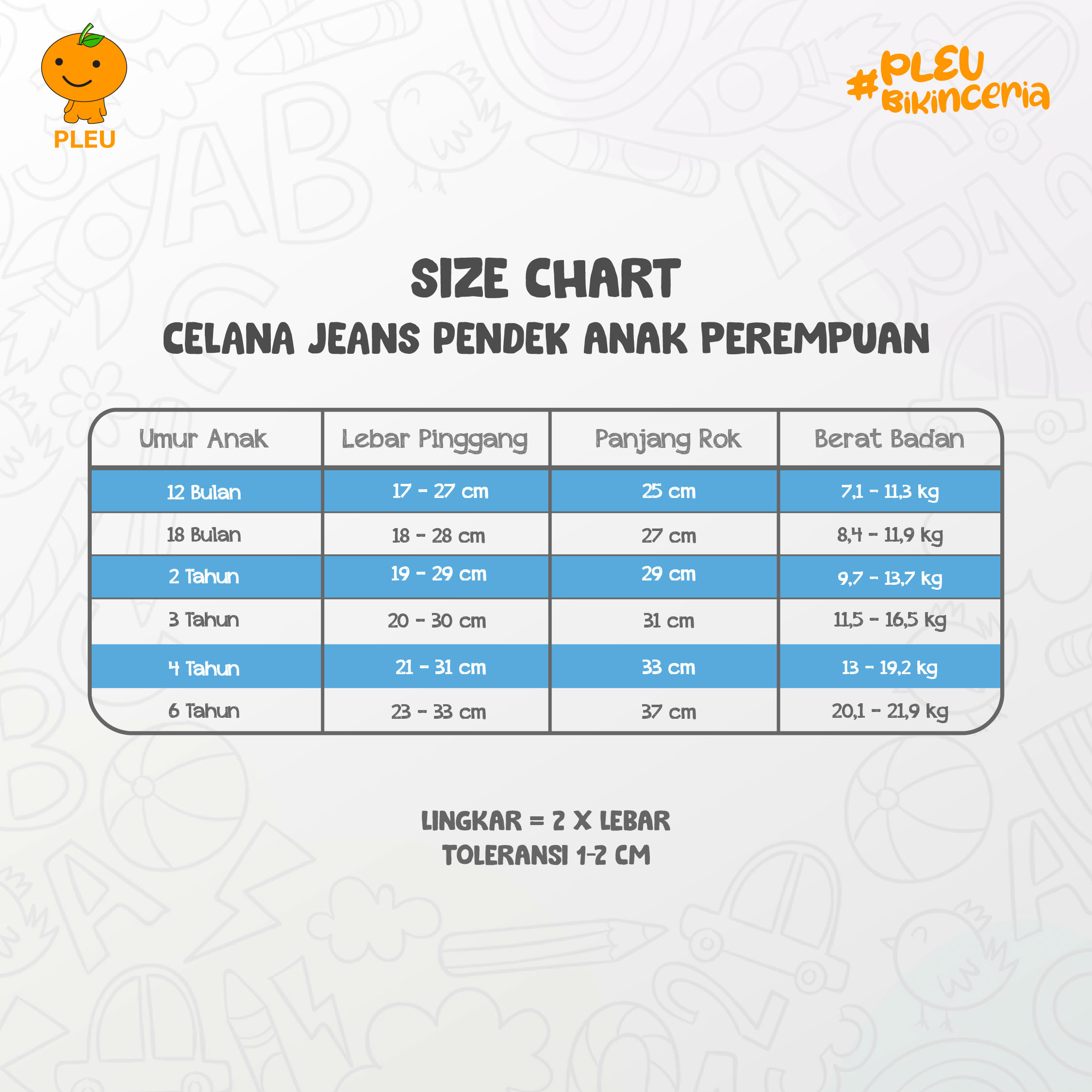 – Ukuran : 12 bulan, 18 bulan, 2 tahun, 3 tahun, 4 tahun, dan 6 tahun