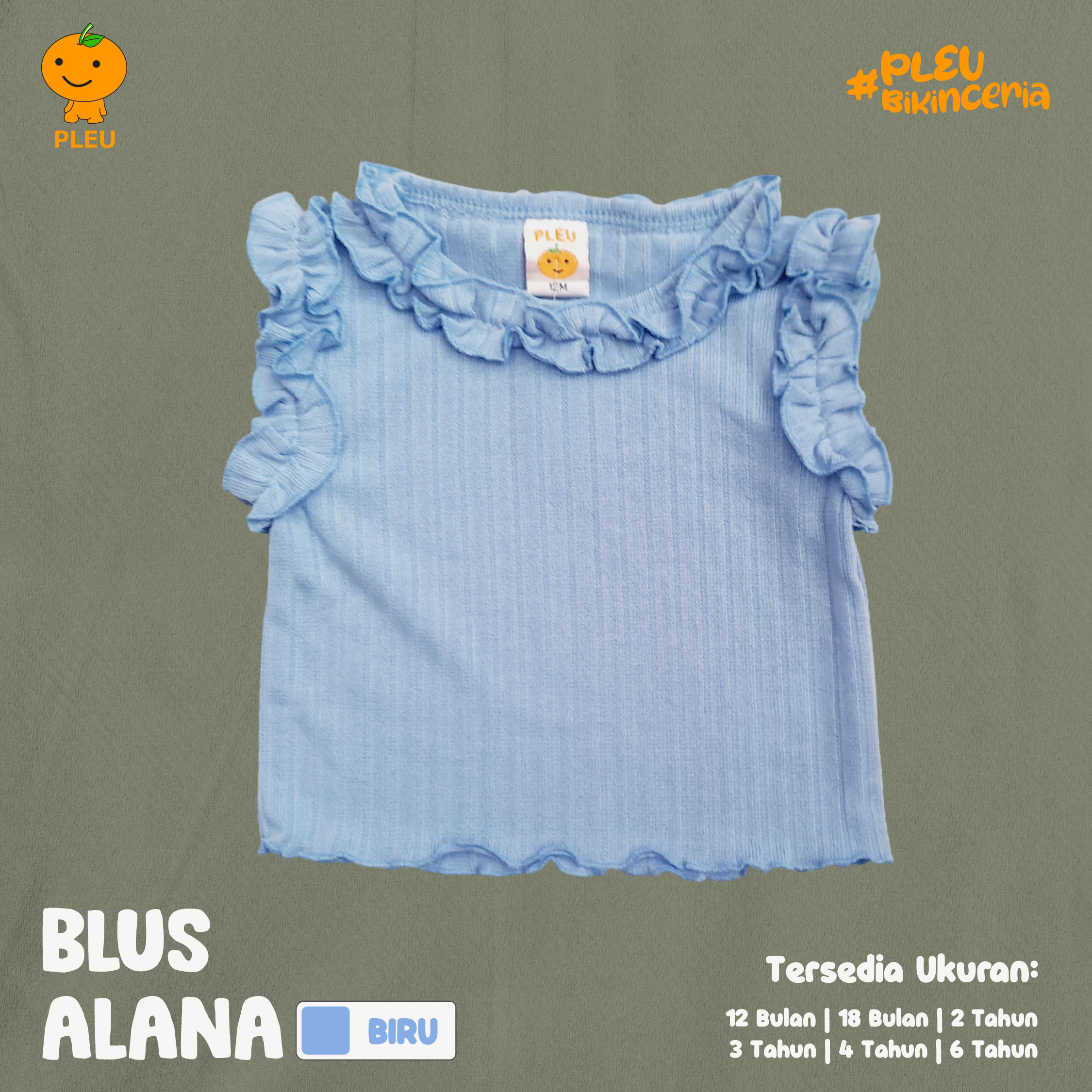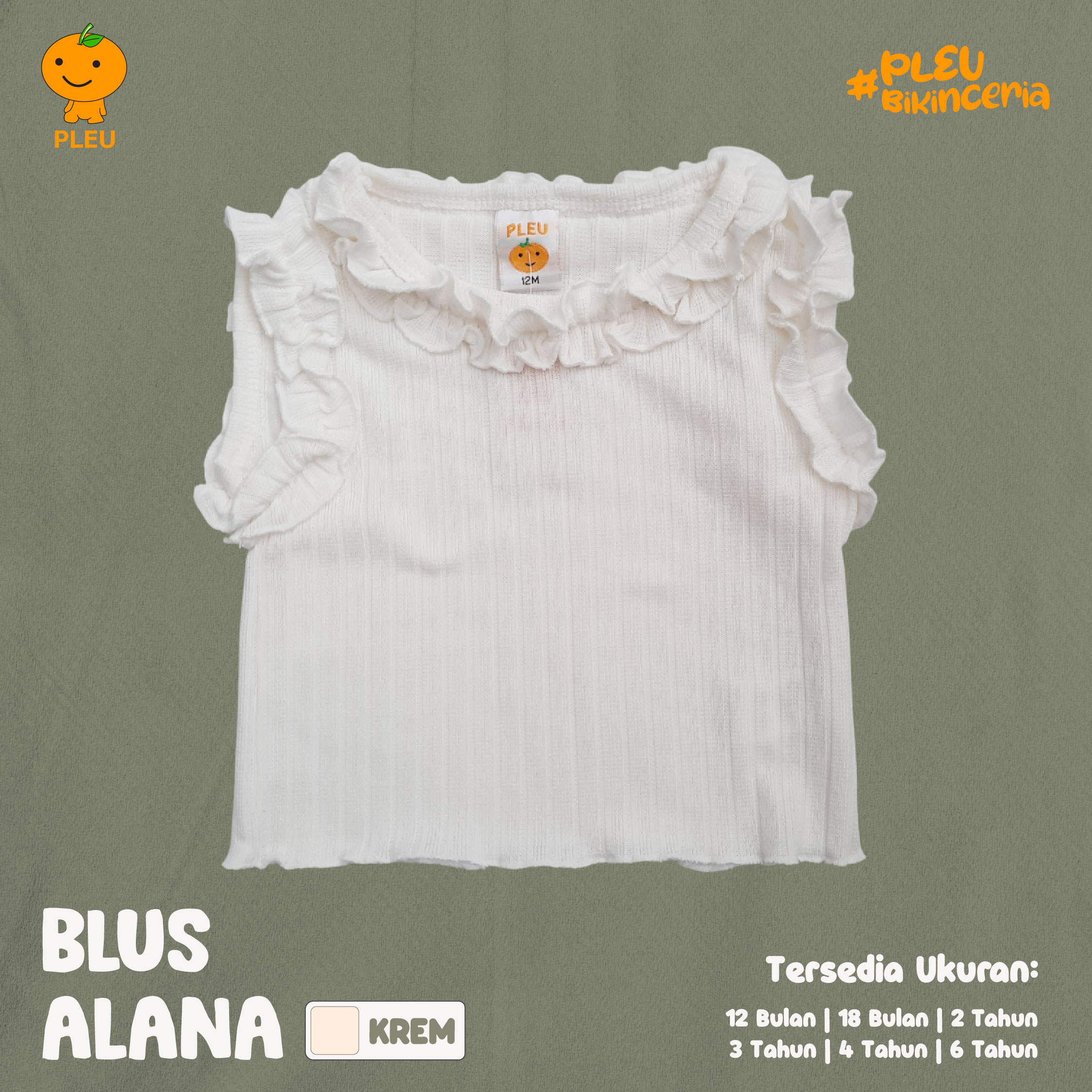 – Ukuran : 12 bulan, 18 bulan, 2 tahun, 3 tahun, 4 tahun, dan 6 tahun