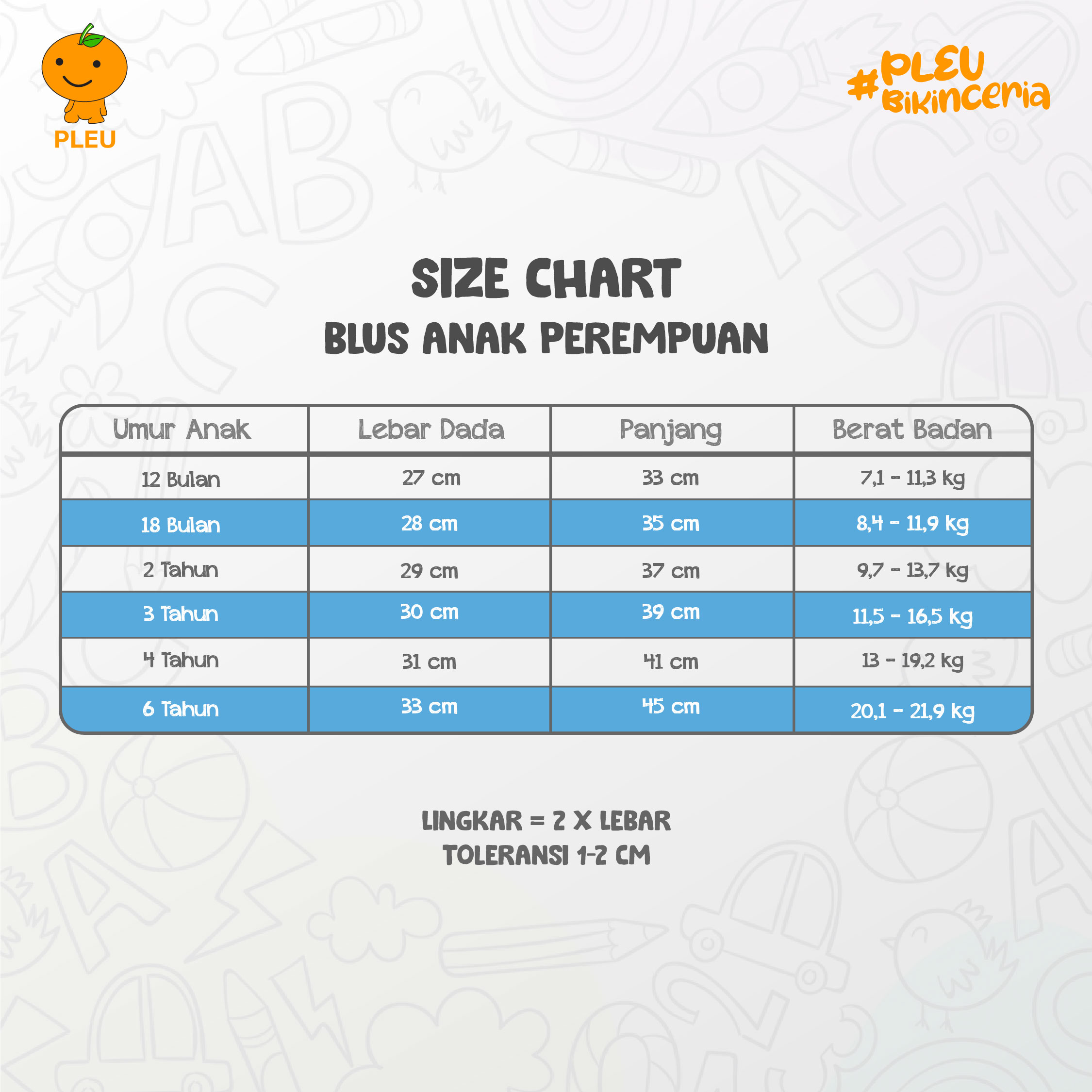 ● 12 bulan : Lebar Dada 27 cm, Panjang 33 cm, Berat Badan 7,1- 11,3 kg