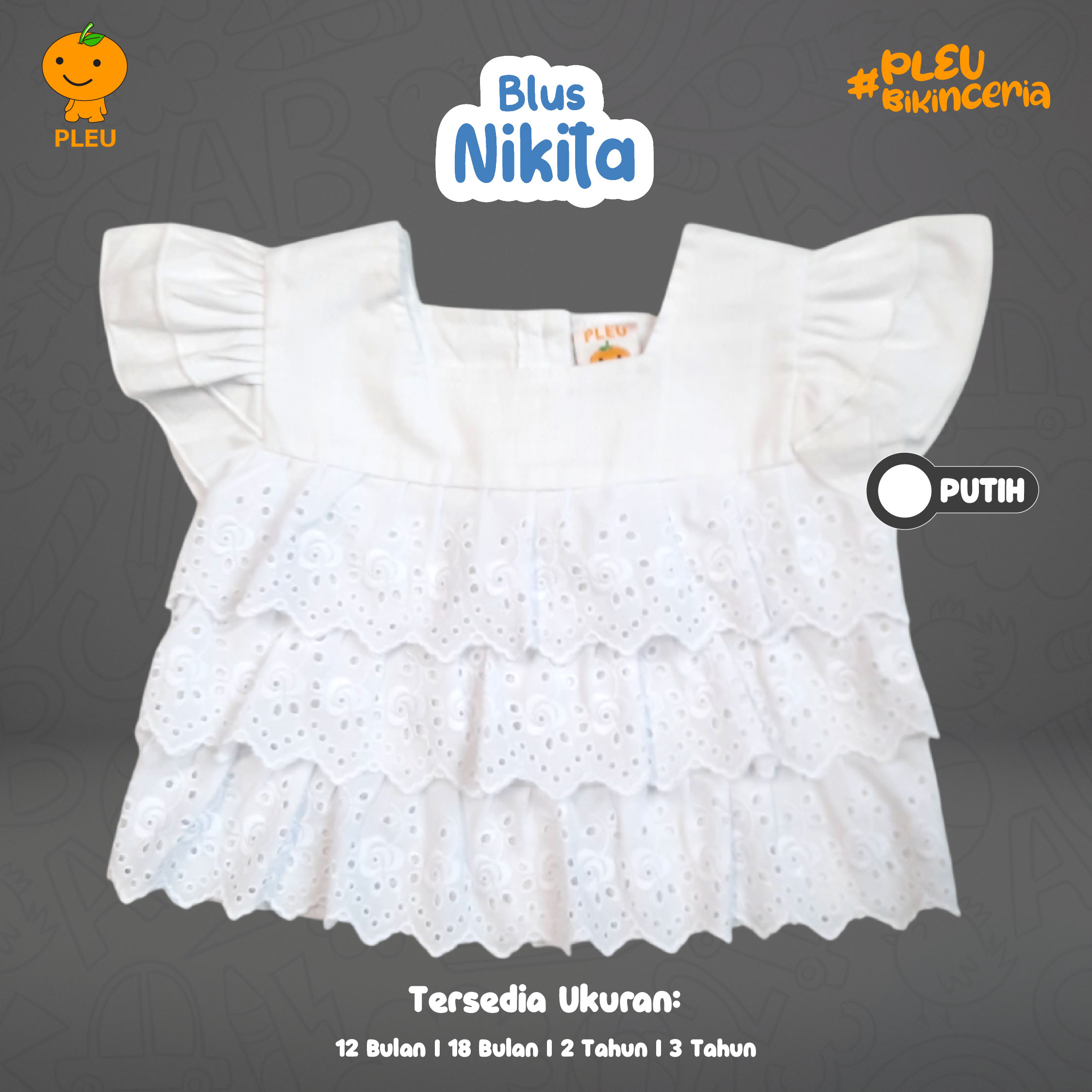 Blus Nikita hadir dalam warna Putih bersih, cocok untuk ukuran 12 bulan hingga 3 tahun. Desainnya manis dan praktis dengan kerah sederhana, lengan pendek puff yang lembut, serta detail renda halus di bagian dada yang memberi sentuhan girly tanpa ribet. Keunikan utama adalah detail broderie anglais pada bagian bawah bibir blus yang memberi tekstur lembut, dipadukan dengan bahan katun berkualitas yang lembut di kulit, adem dipakai sepanjang hari, dan mudah dirawat. Semua bahan telah bersertifikat SNI, menjamin keamanan kain, kekuatan jahitan, serta kenyamanan maksimal untuk aktivitas bermain dan momen keluarga.