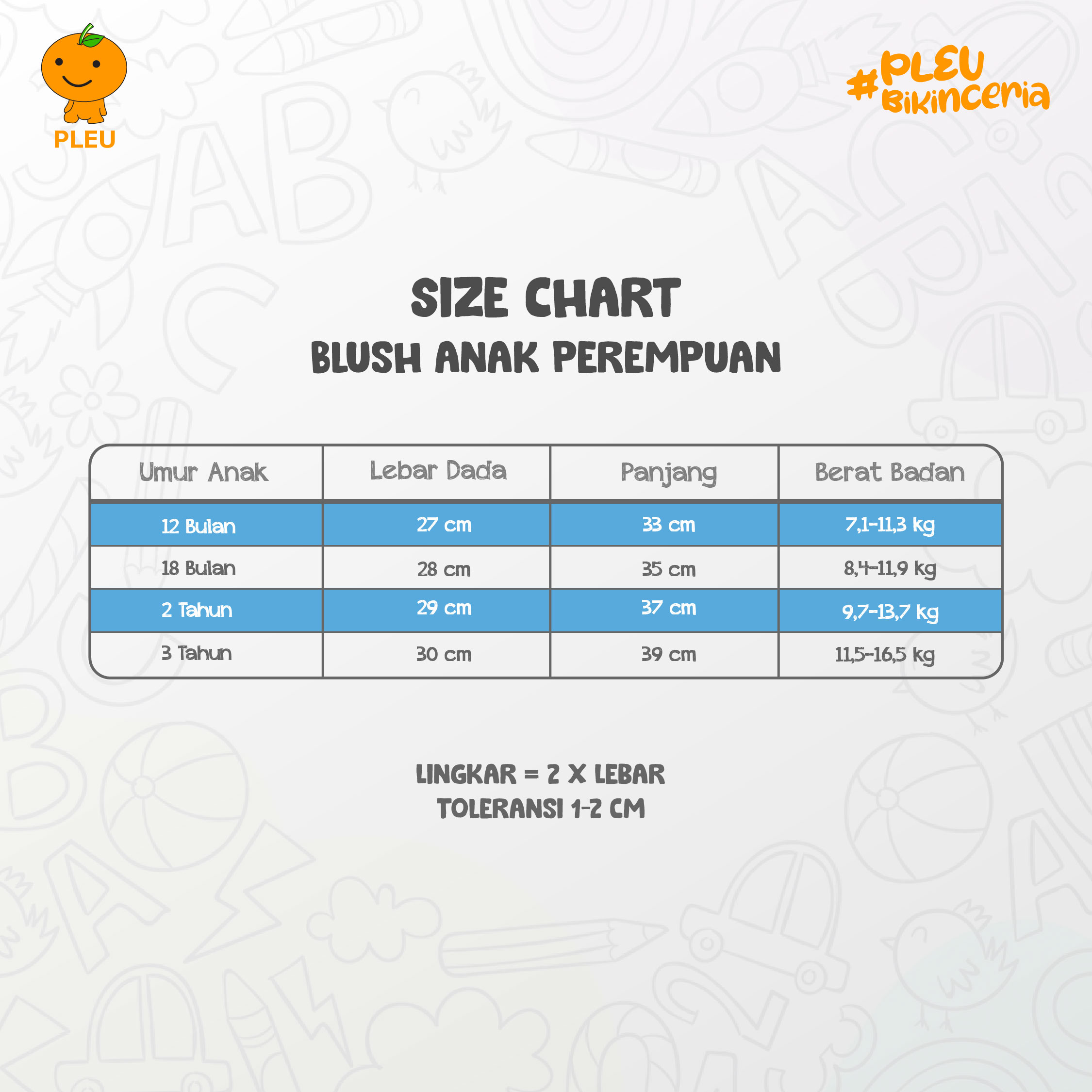 – Ukuran : 12 bulan, 18 bulan, 2 tahun, dan 3 tahun