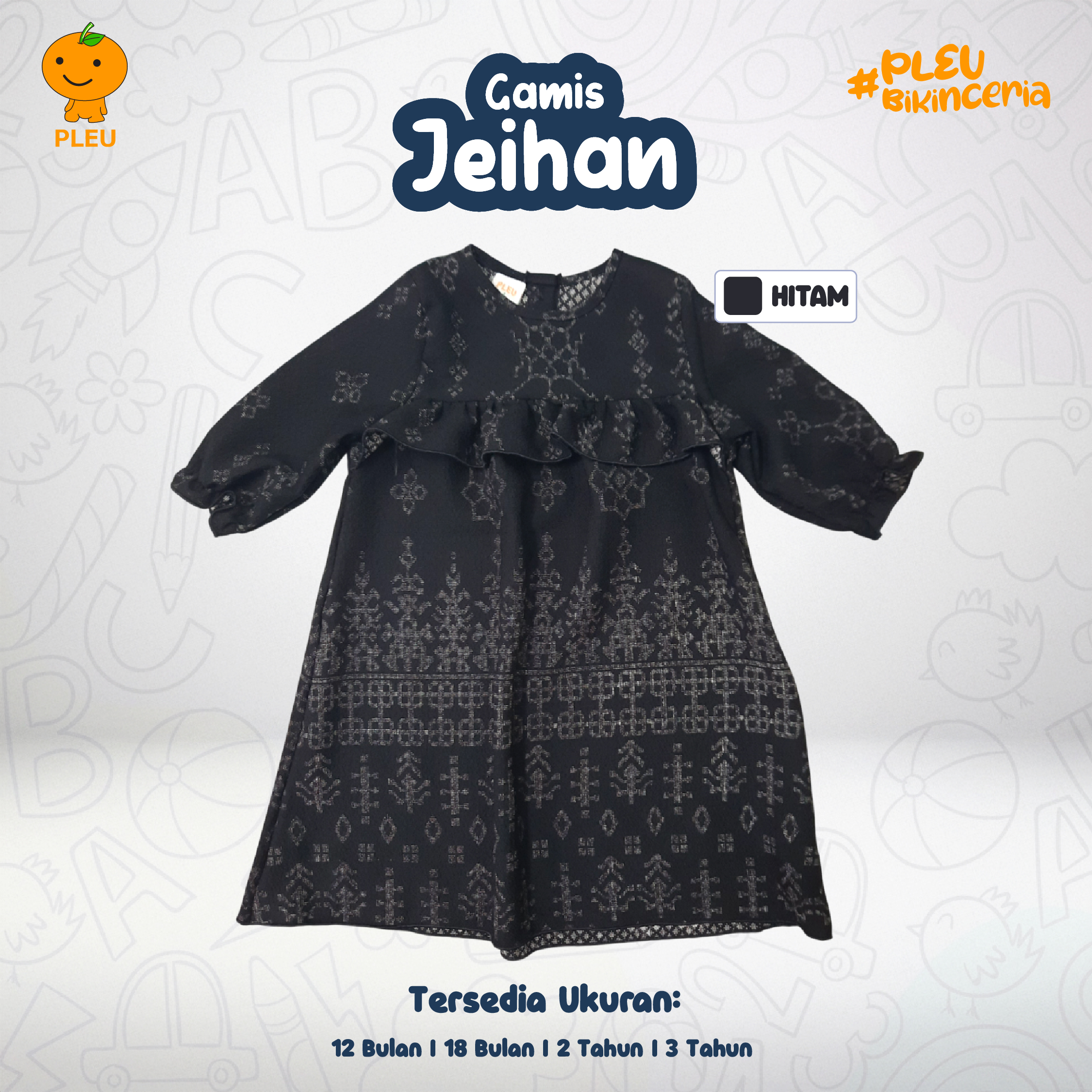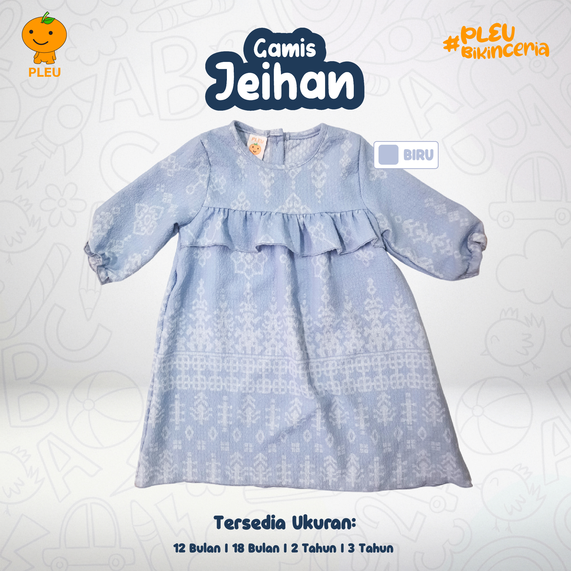 Gamis Jeihan hadir dalam dua pilihan warna Biru dan Hitam untuk ukuran 12 bulan hingga 3 tahun. Gamis ini mengusung motif bordir halus berbentuk pola tradisional yang airy, dengan potongan A-line yang longgar sehingga nyaman dipakai anak saat bermain maupun beraktivitas. Keunikan utama ada pada detail renda kecil di bagian dada dan lengan, serta kain brokat tipis yang tetap lembut di kulit. Bahan utama terbuat dari katun berkualitas tinggi yang adem, menyerap keringat, dan mudah dirawat. Semua bahan telah bersertifikat SNI, menjamin keamanan kain, kekuatan jahitan, serta kenyamanan saat beraktivitas sepanjang hari.