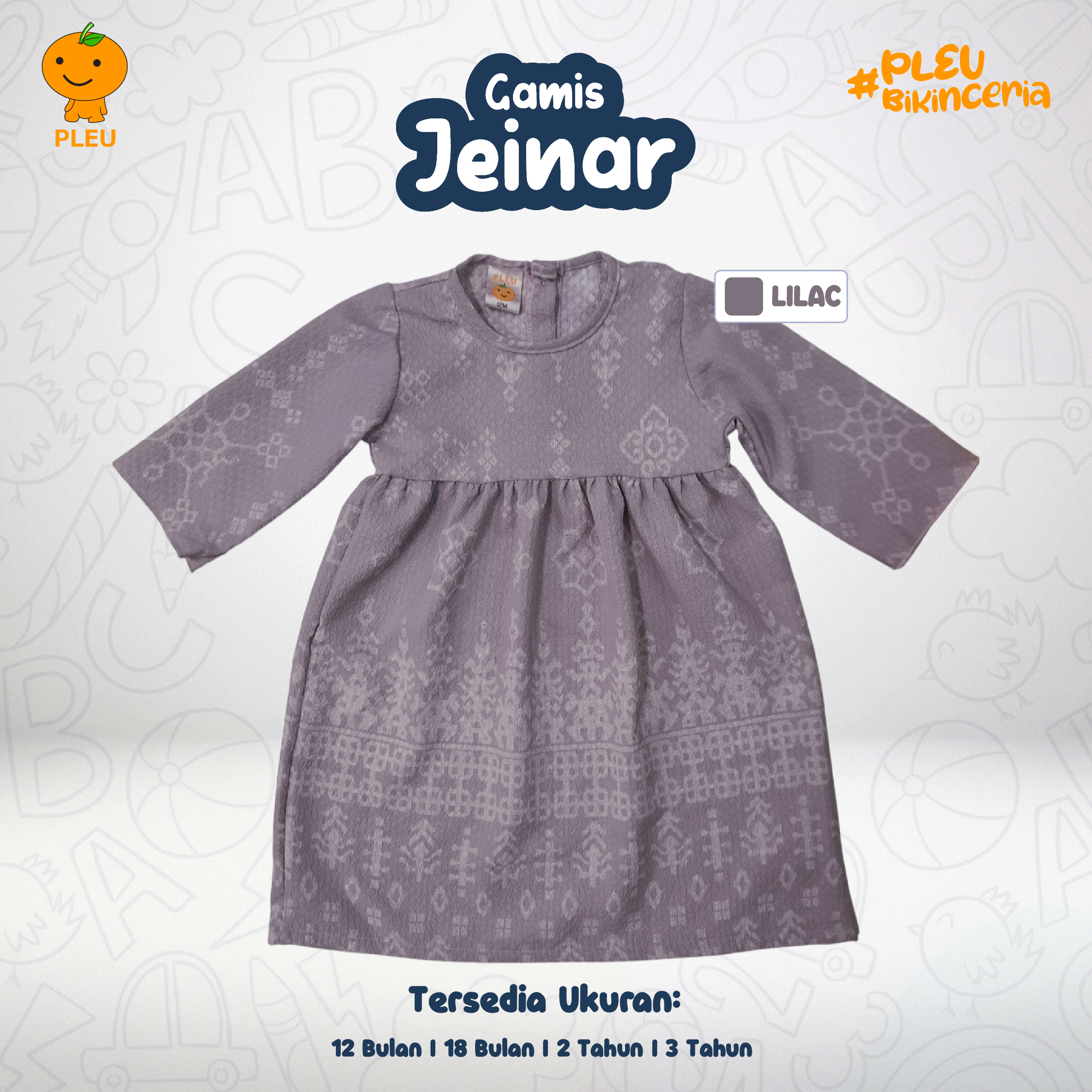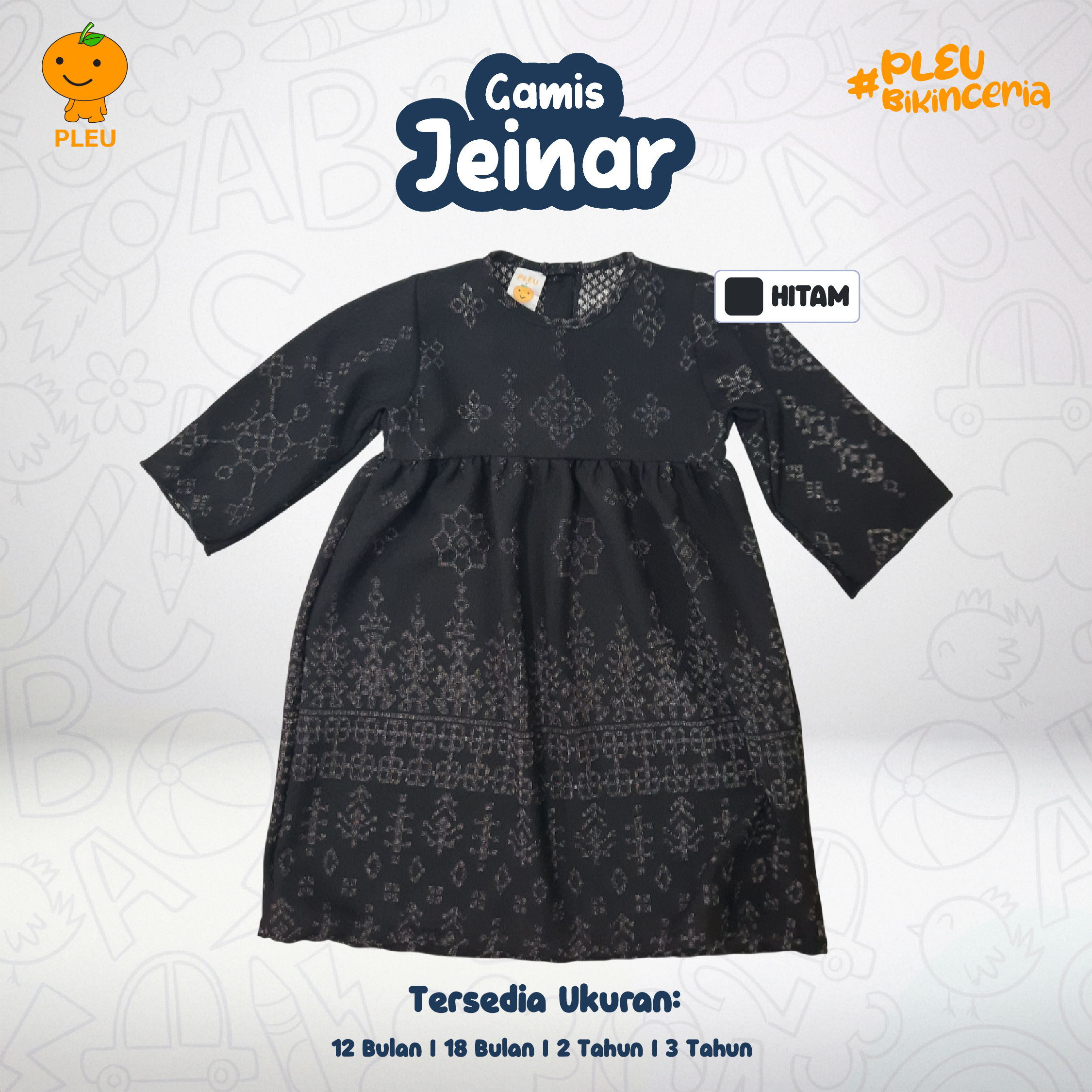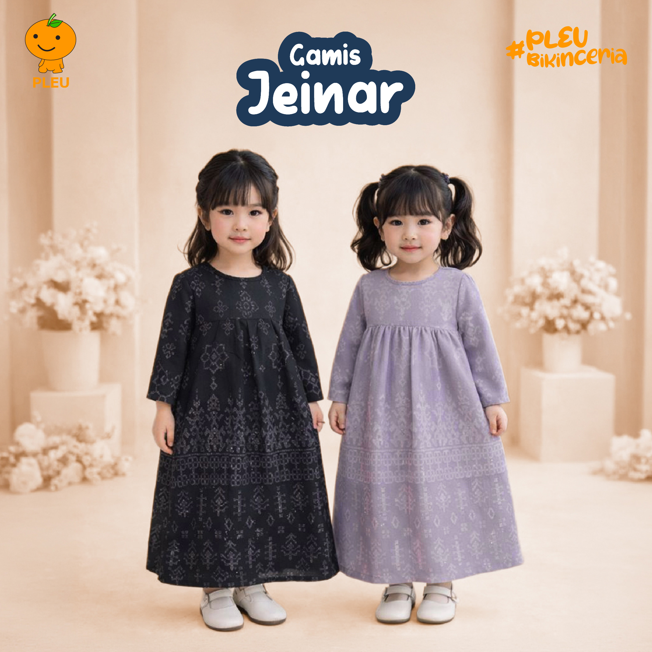Gamis Jeinar hadir dalam dua pilihan warna Lilac dan Hitam untuk ukuran 12 bulan sampai 3 tahun. Gamis ini menonjolkan motif bordir halus dan pola etnik yang elegante, dengan potongan A-line yang longgar agar gerak bayi leluasa selama bermain dan belajar. Keunikan utama terletak pada kombinasi lengan panjang puff yang lembut, renda halus di bagian dada, dan detail renda di bagian bawah rok untuk sentuhan manis. Bahan utama adalah katun berkualitas tinggi yang adem, menyerap keringat, dan nyaman di kulit sensitif anak, serta mudah dirawat. Semua bahan telah bersertifikat SNI, menjamin keamanan kain, kekuatan jahitan, dan kenyamanan sepanjang hari untuk aktivitas harian si kecil.