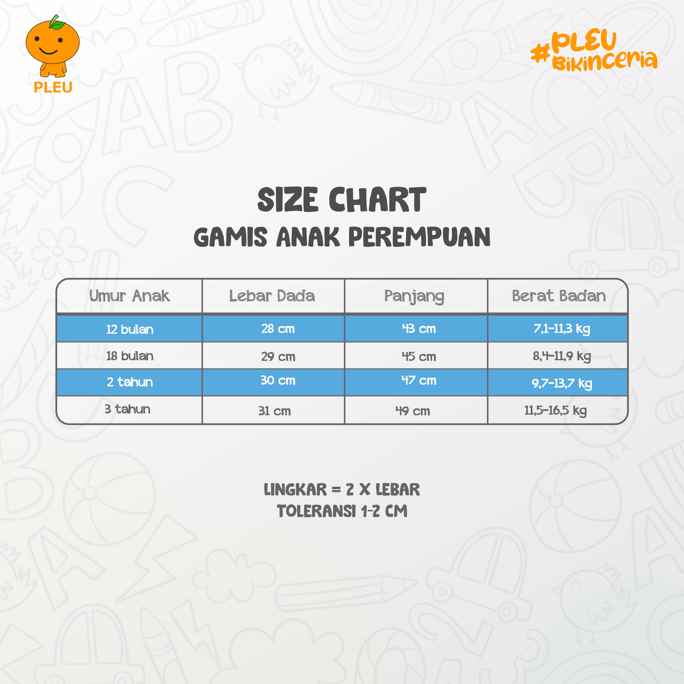 – Ukuran : 12 bulan, 18 bulan, 2 tahun, dan 3 tahun