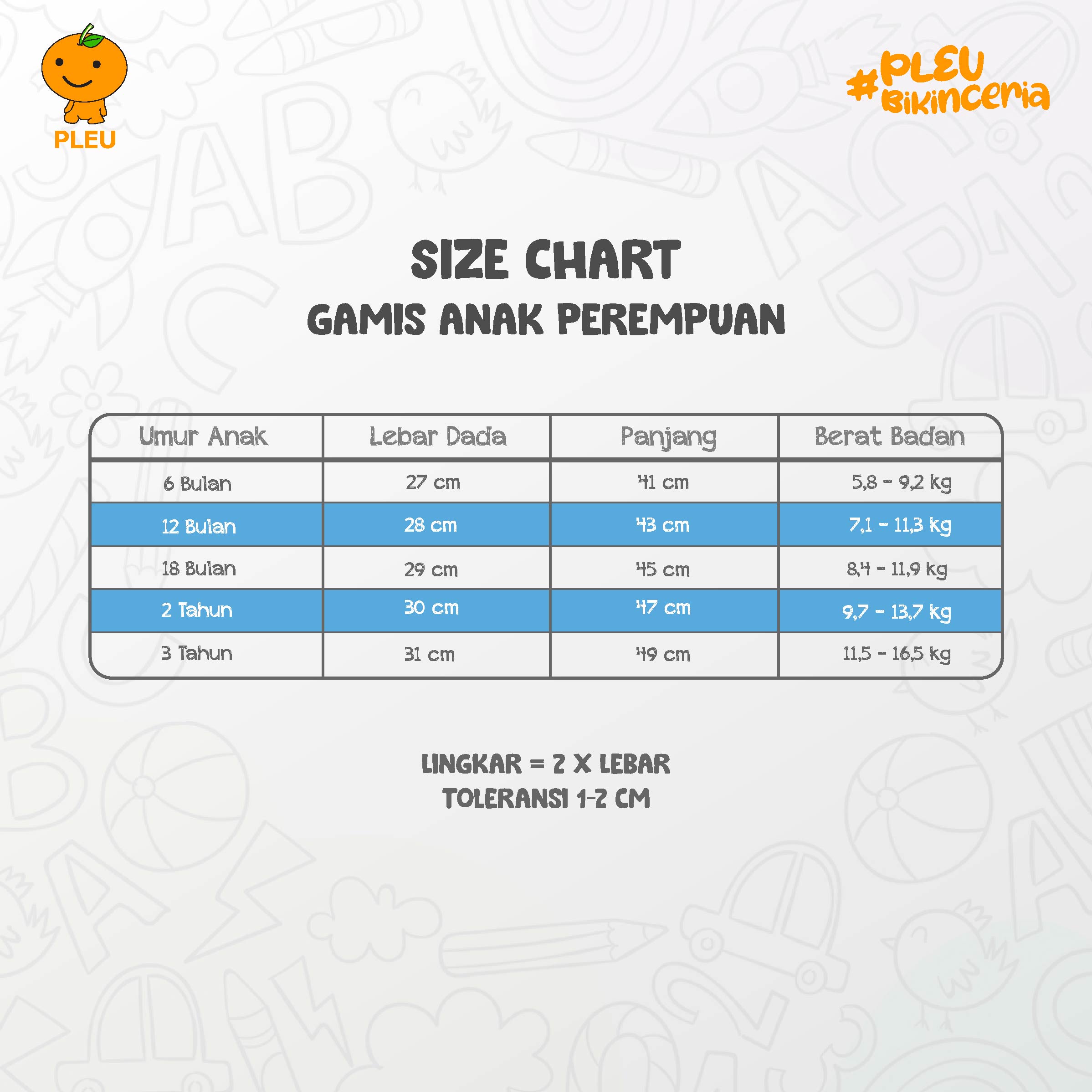 ● 2 tahun : Lebar Dada 30 cm, Panjang 47 cm, Berat Badan 9,7-13,7 kg