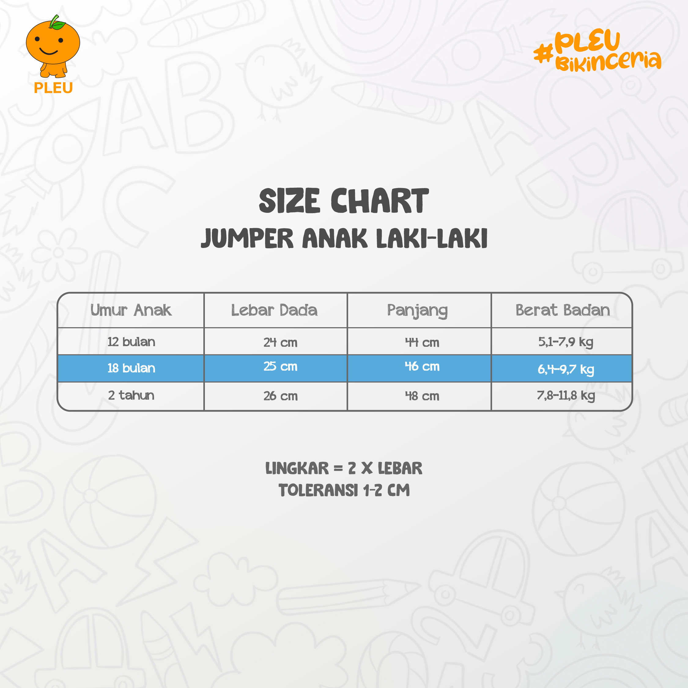 – 12 bulan : Lebar Dada 26 cm, Panjang 40 cm, Berat Badan 7,8-11,8 kg