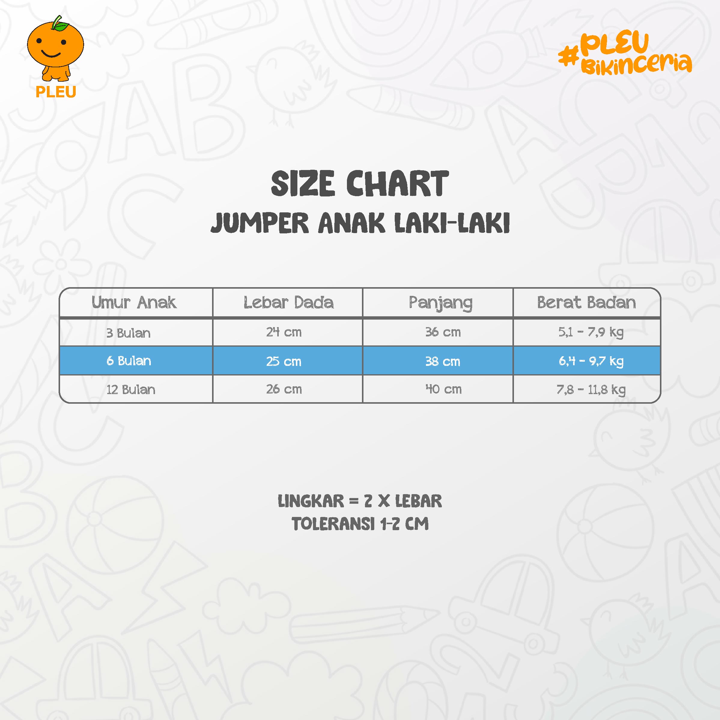 – Ukuran : 3 bulan, 6 bulan, dan 12 bulan. – Toleransi selisih ukuran sekitar 1-2 cm