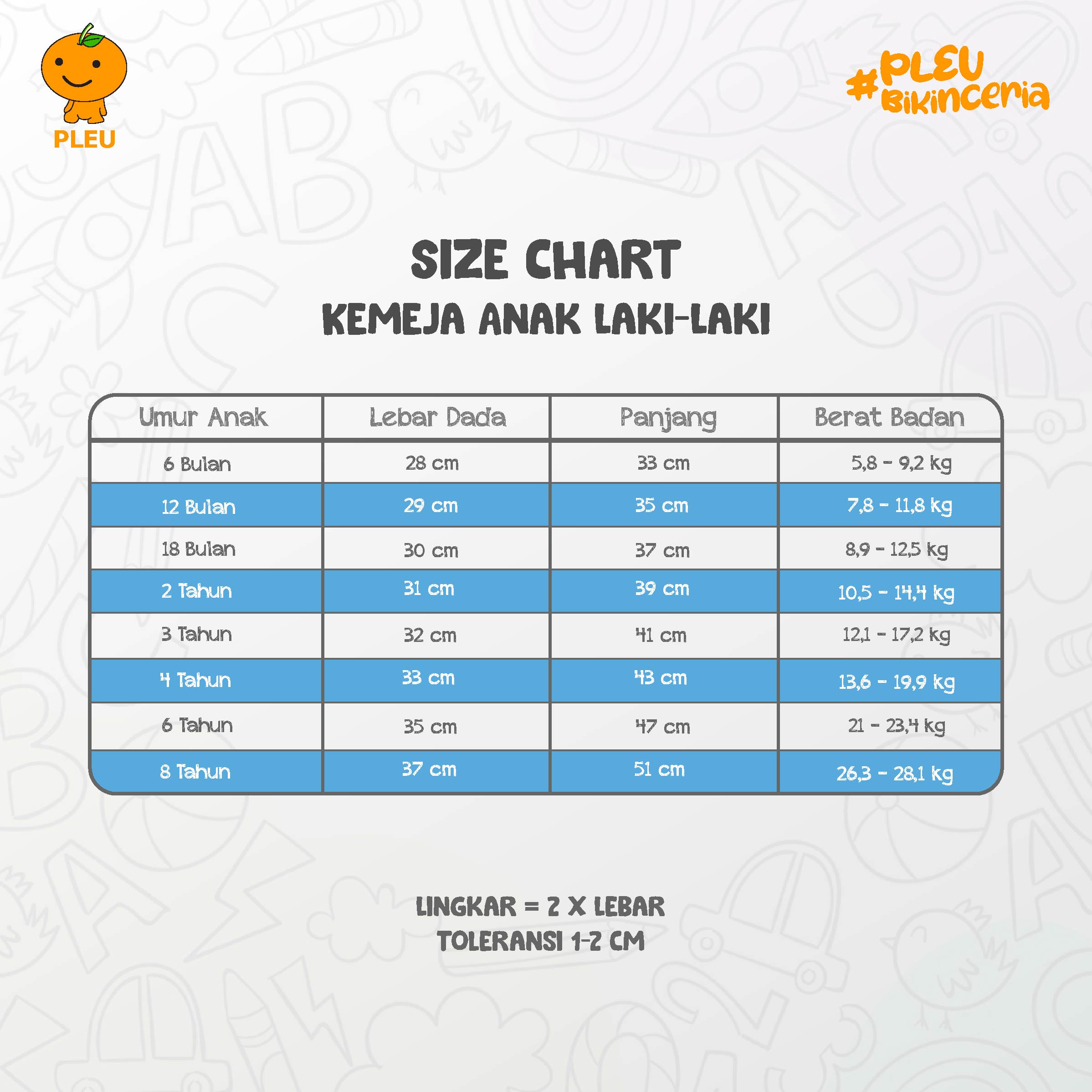 – Ukuran : 6 bulan, 12 bulan, 18 bulan, 2 tahun, 3 tahun, 4 tahun, 6 tahun dan 8 tahun