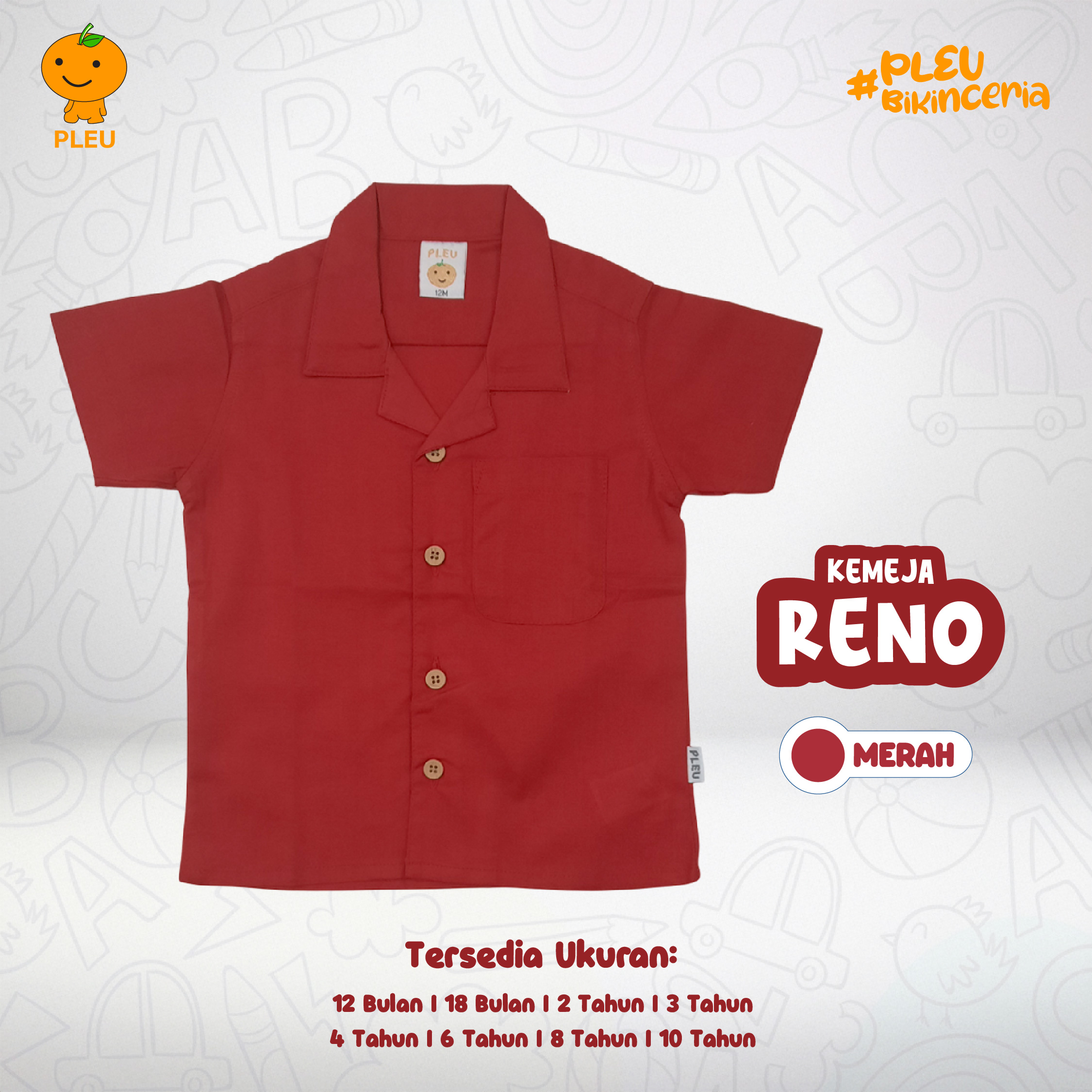 Kemeja Reno (12 bulan–10 tahun) hadir dalam dua pilihan warna bold—merah dan hitam—dengan potongan kemeja lengan pendek dan kerah klasik yang rapi, pas dipakai untuk acara santai maupun semi-formal. Keunikan: desain polos dengan kantong dada praktis dan kancing depan membuat pemakaian cepat dan terlihat selalu rapi; potongan yang tidak kaku memberi ruang gerak luas untuk anak aktif. Bahan terasa ringan, adem, dan lembut ke kulit, serta sudah bersertifikat SNI — aman untuk kulit sensitif, tidak mudah pudar, dan mudah dicuci; pilihan simpel, tahan pakai, dan stylish agar si kecil selalu tampil percaya diri.