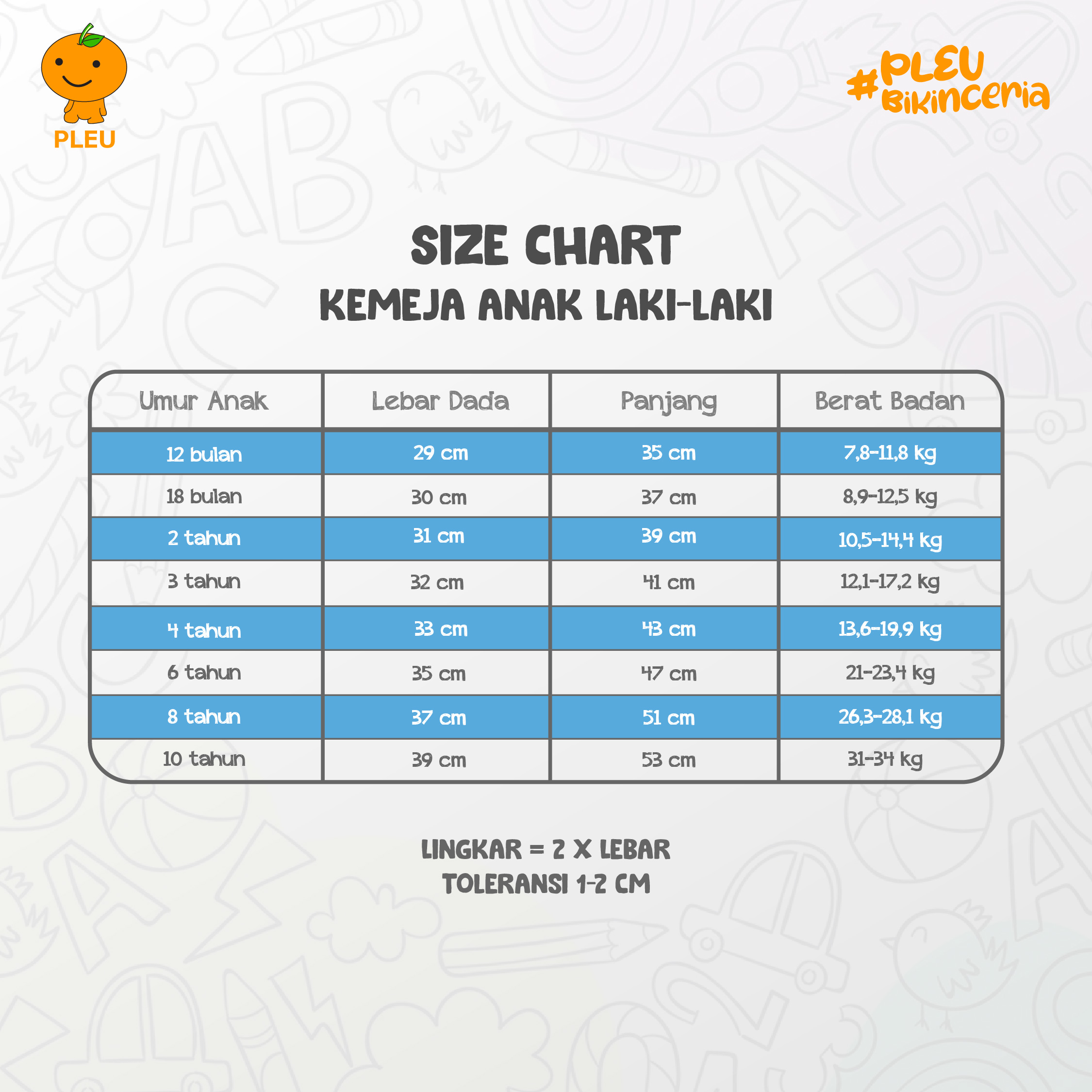 – 12 bulan : Lebar Dada 29 cm, Panjang 35 cm, Berat Badan 7,8-11,8 kg