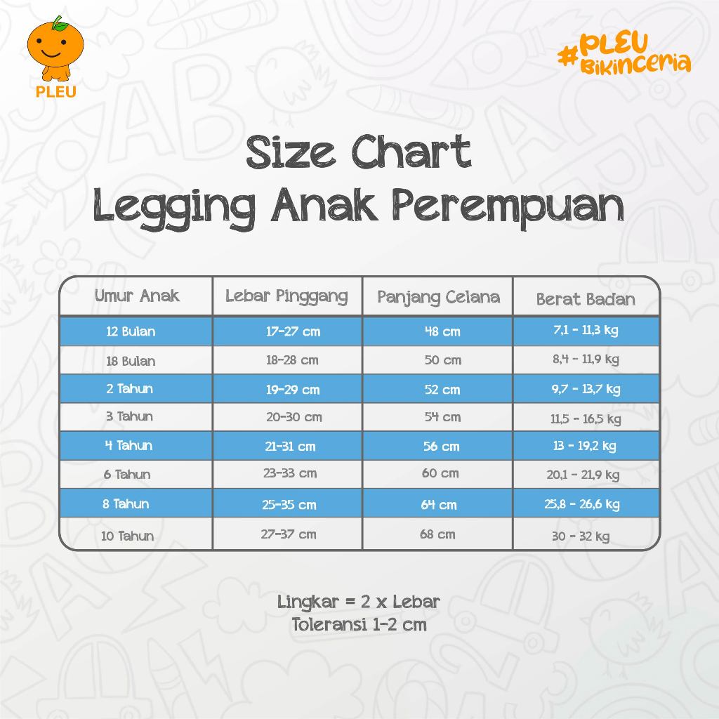 – Ukuran : 12 bulan, 18 bulan, 2 tahun, 3 tahun, 4 tahun, 6 tahun, 8 tahun, dan 10 tahun