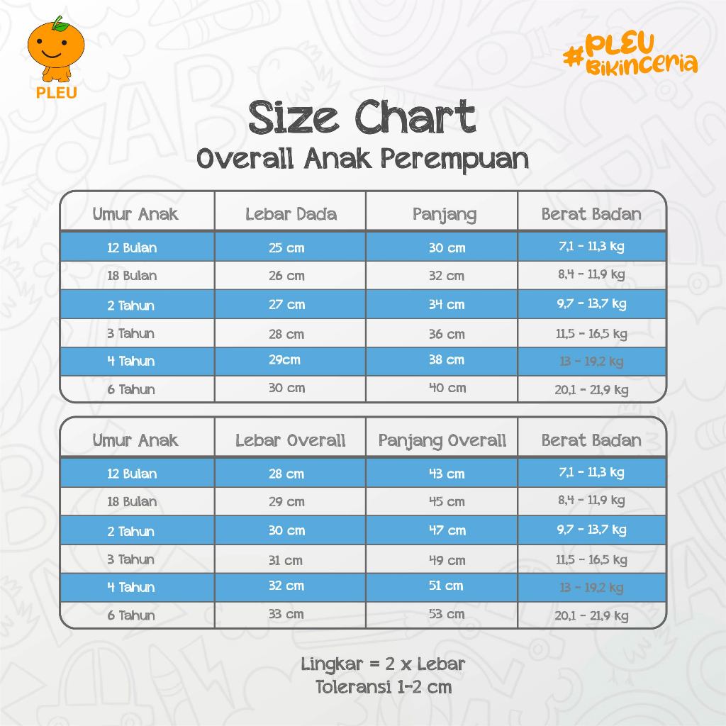 ● 4 tahun : Lebar Dada 29 cm, Panjang 38 cm, Lebar Overall 32 cm, Panjang Overall 51 cm, Berat Badan 13-19,2 kg