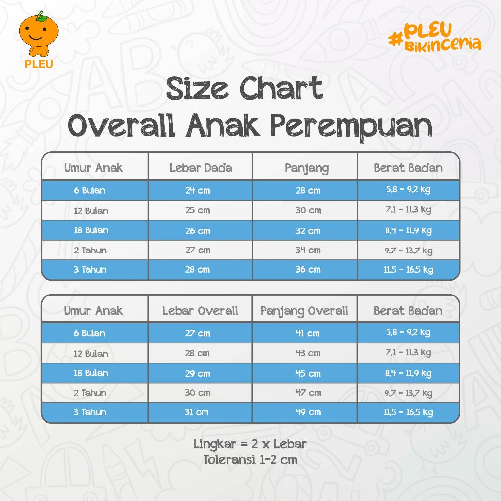 ● 18 bulan : Lebar Dada 26 cm, Panjang 32 cm, Lebar Overall 29 cm, Panjang Overall 45 cm, Berat Badan 8,4-11,9 kg