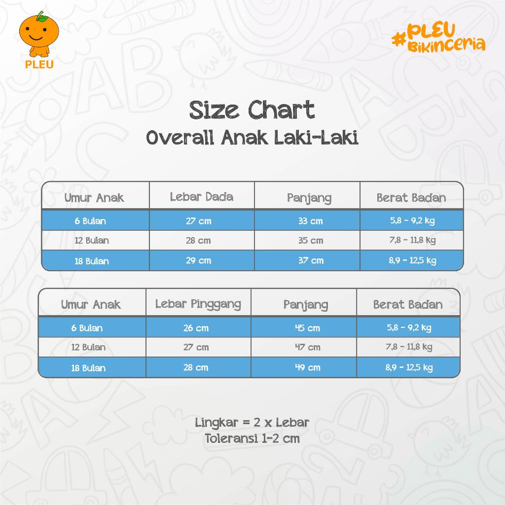 ● 18 bulan : Lebar Dada 29 cm, Panjang Kaos 37 cm, Lebar Pinggang 28 cm, Panjang Celana 49 cm, Berat Badan 8,9-12,5 kg