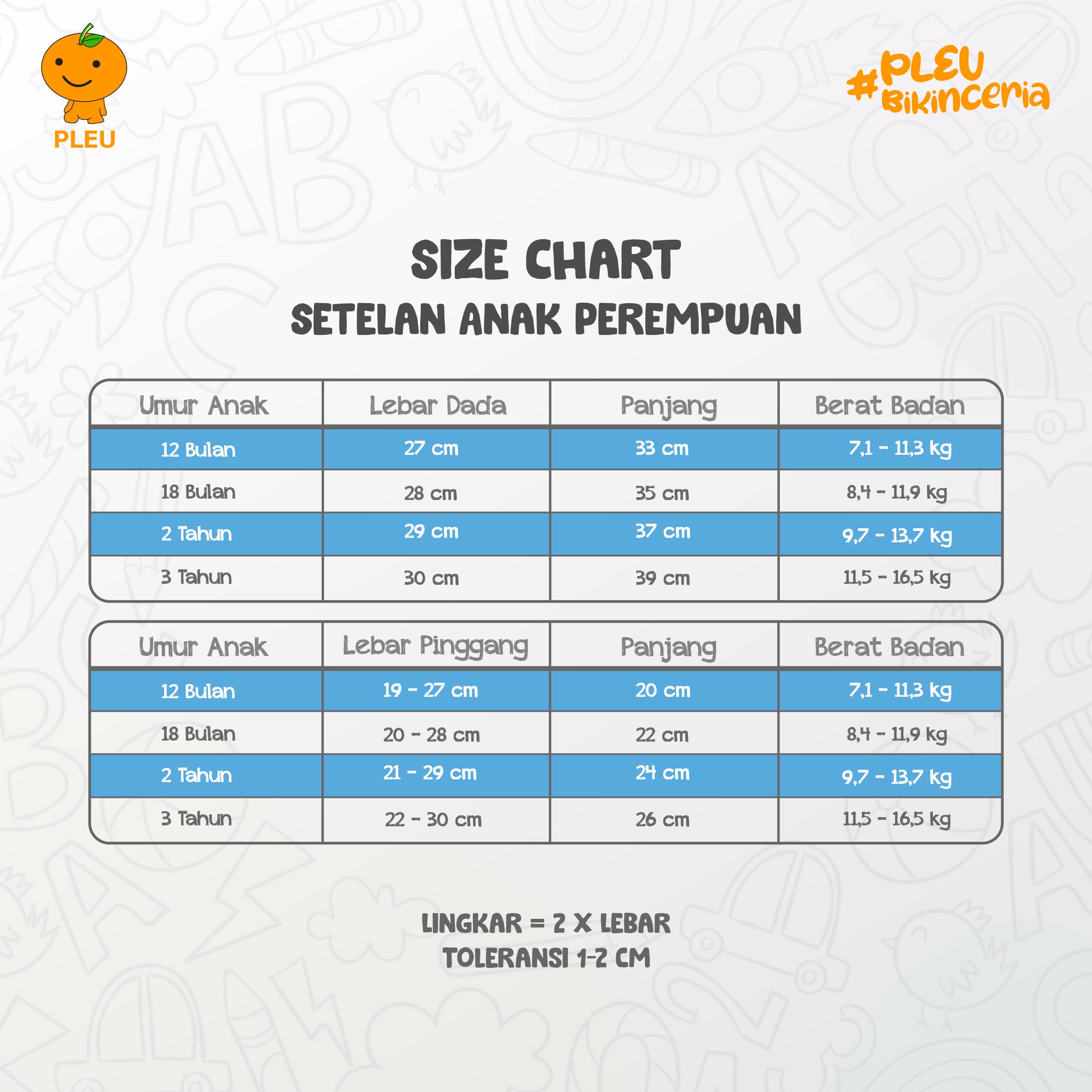 ● 18 bulan : Lebar Dada 28 cm, Panjang 35 cm, Lebar Pinggang 20-28 cm, Panjang Rok 22 cm, Berat Badan 8,4-11,9 kg
