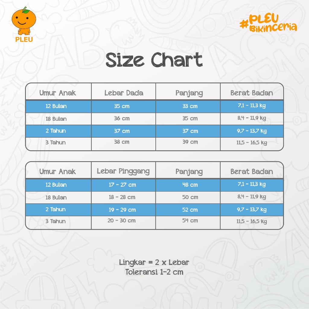 – Ukuran : 12 bulan, 18 bulan, 2 tahun, dan 3 tahun