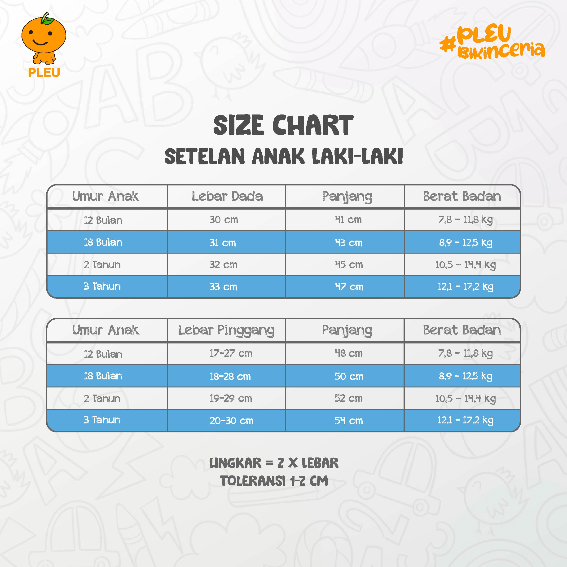 ● 18 bulan : Lebar Dada 31 cm, Panjang 43 cm, Lebar Pinggang 18-28 cm, Panjang Celana 50 cm, Berat Badan 8,9-11,5 kg