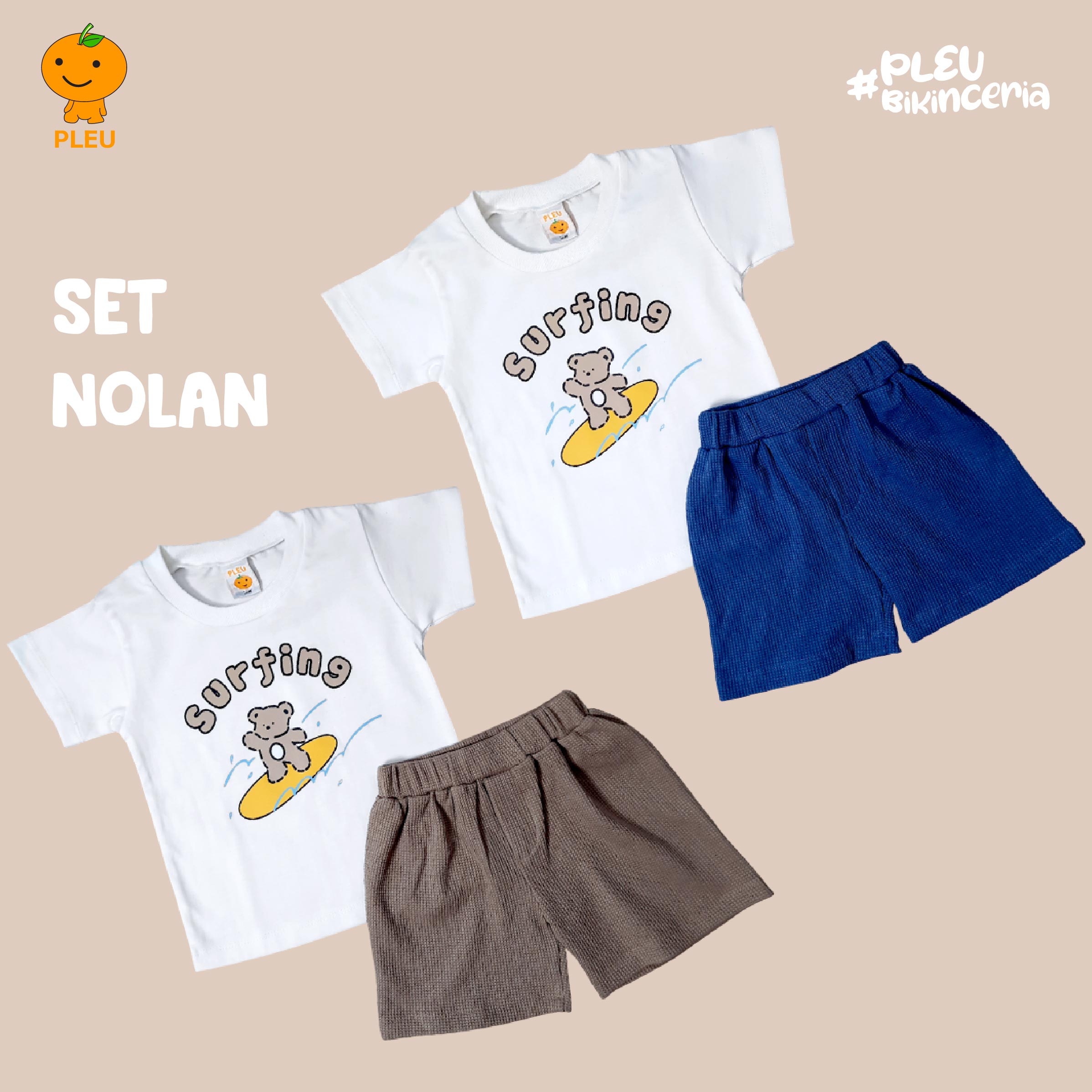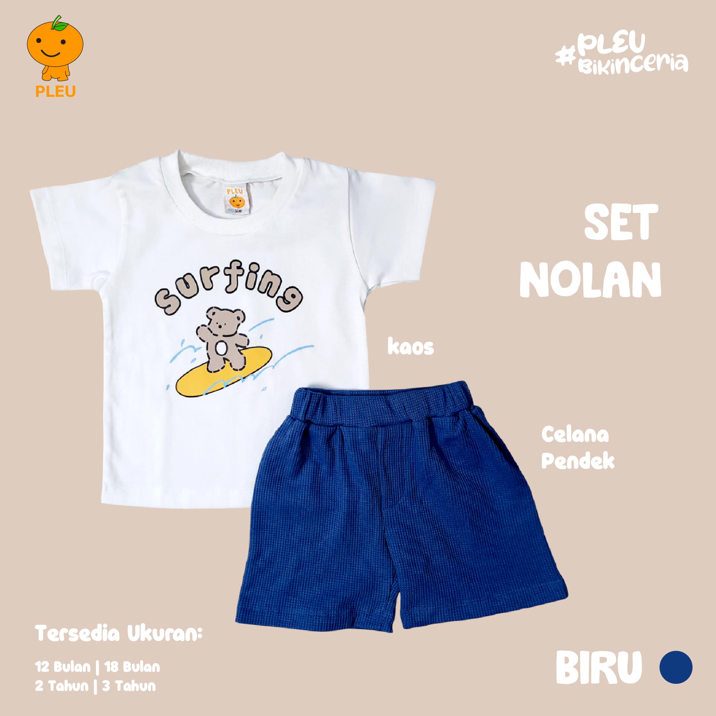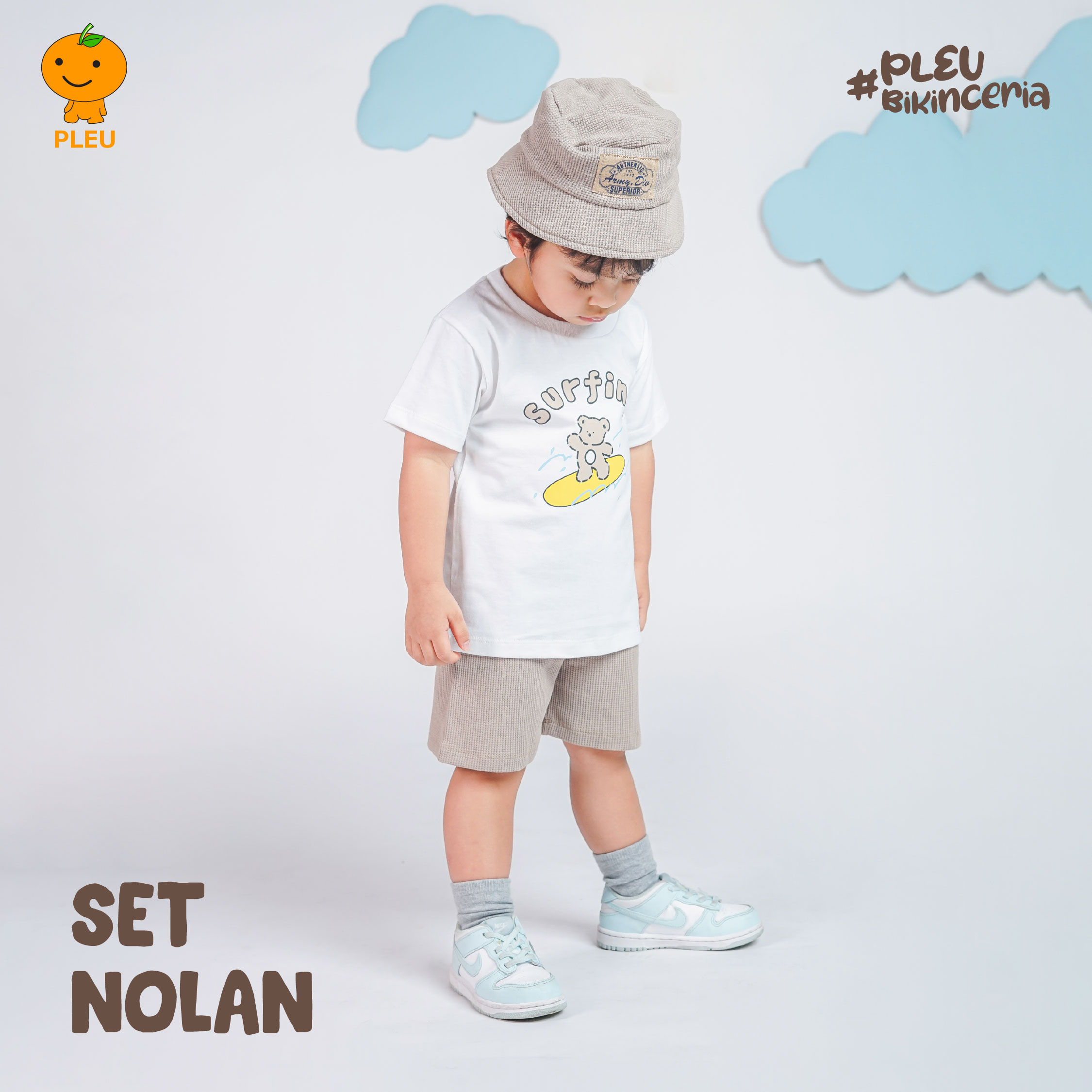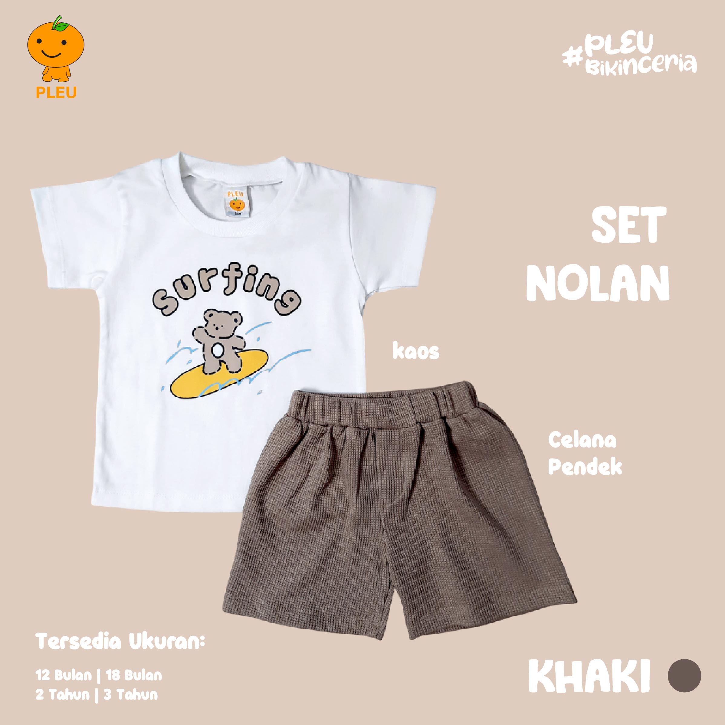 Set Nolan adalah pilihan seru untuk si kecil, tersedia dalam ukuran 12 bulan hingga 3 tahun dengan dua warna menarik: biru dan khaki. Set ini terdiri dari kaos lucu bertema surfing dan celana pendek yang nyaman, terbuat dari bahan lembut yang memudahkan anak bergerak saat bermain. Desain yang playful dan stylish membuat Set Nolan sempurna untuk aktivitas sehari-hari atau acara santai.