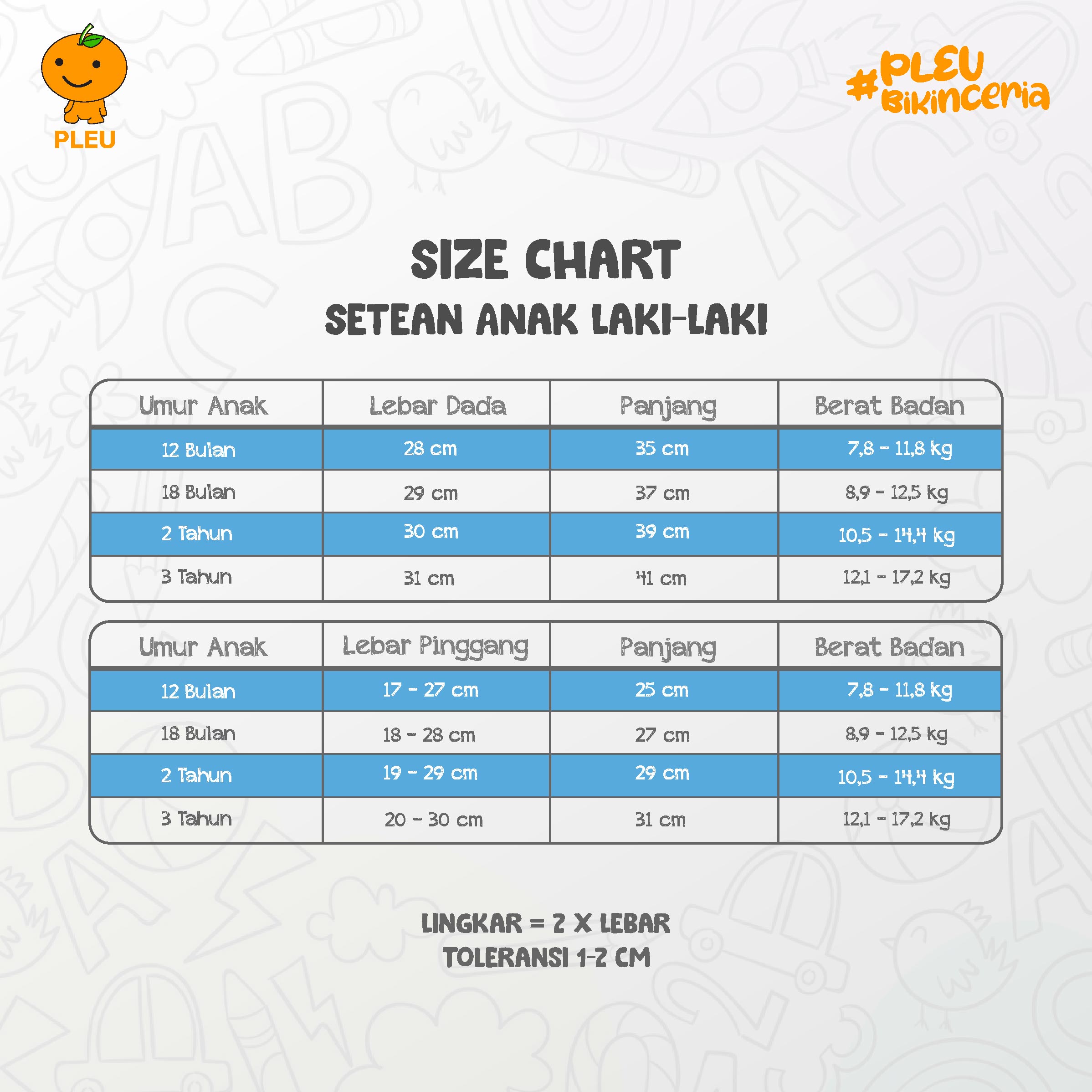 ● 12 bulan : Lebar Dada 28 cm, Panjang 35 cm, Lebar Pinggang 17-27 cm, Panjang Celana 25 cm, Berat Badan 7,8-11,8 kg