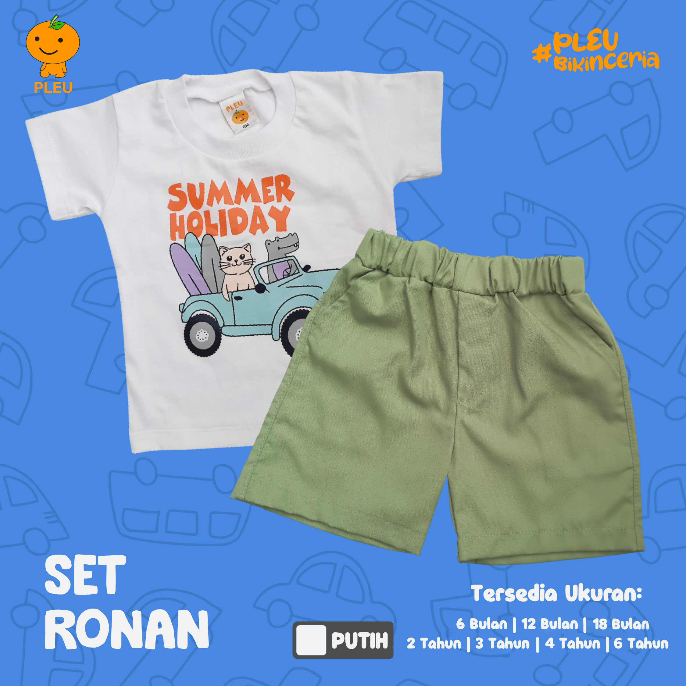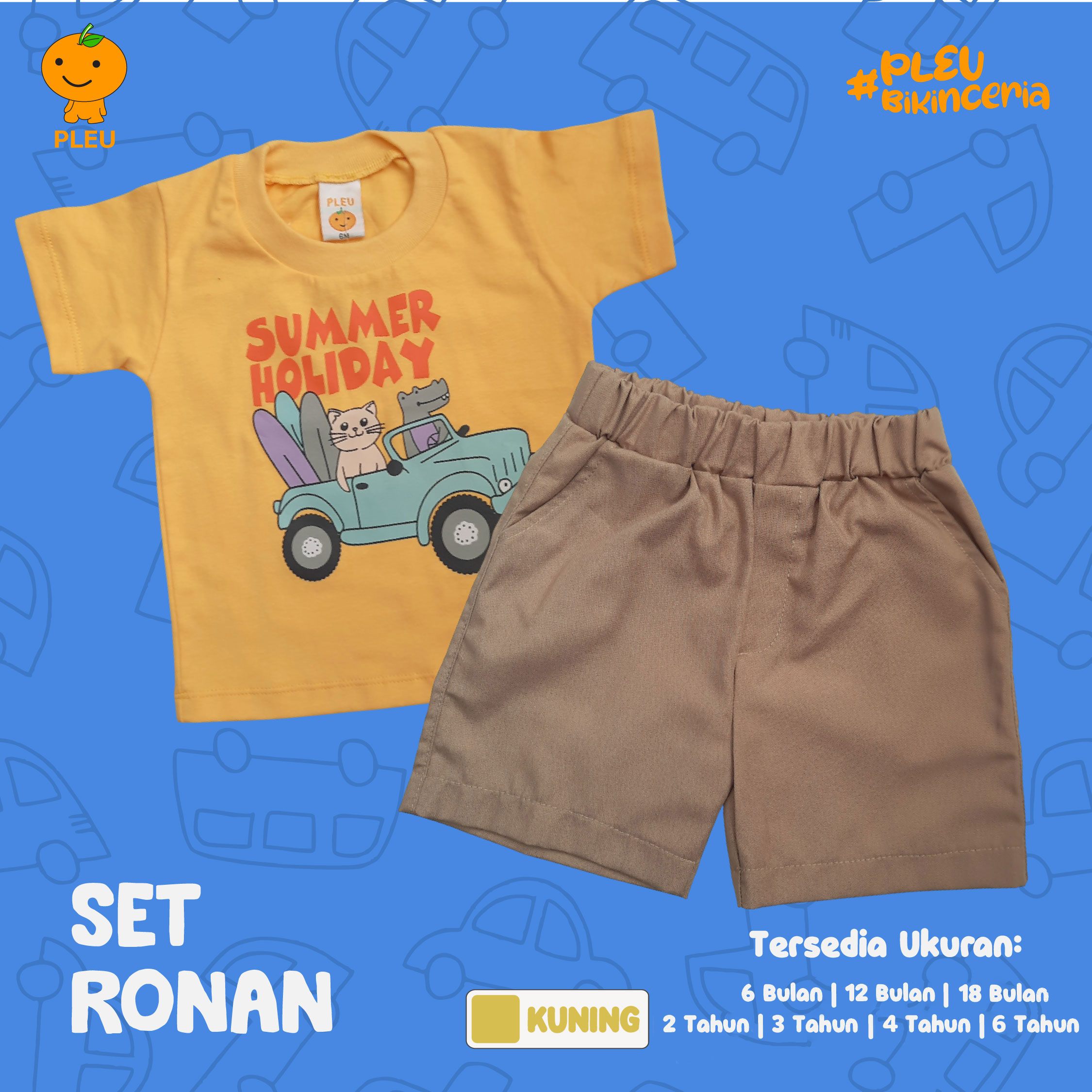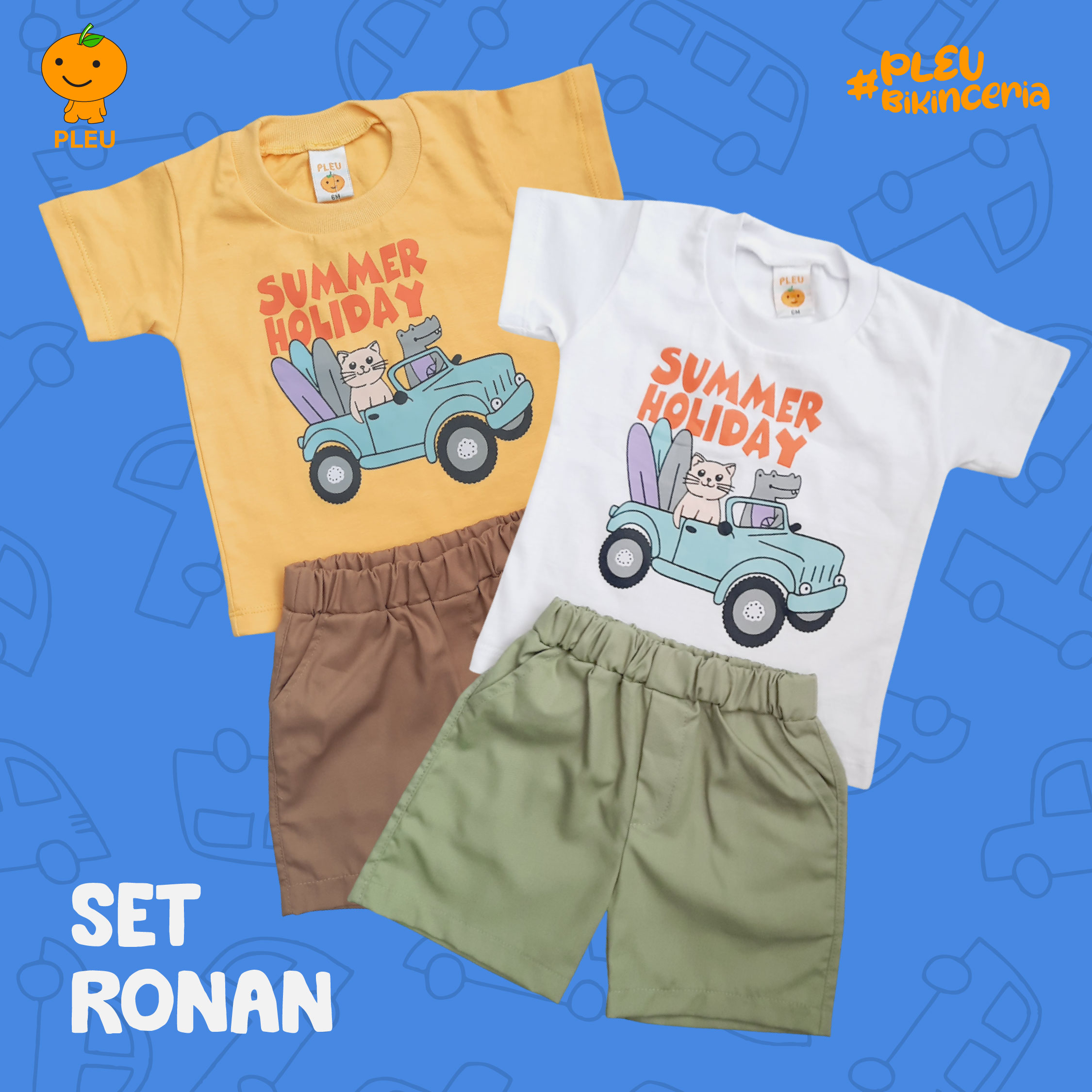 Setelan Ronan merupakan setelan yang terdiri dari kaos lengan pendek dengan desain printing di bagian depan bertuliskan “Summer Holiday”, dipadukan dengan celana pendek polos yang nyaman dipakai untuk setiap anak laki-laki. Berbahan lembut yang aman dan nyaman untuk kulit Si Kecil, setelan ini akan membuat si kecil terlihat stylish.