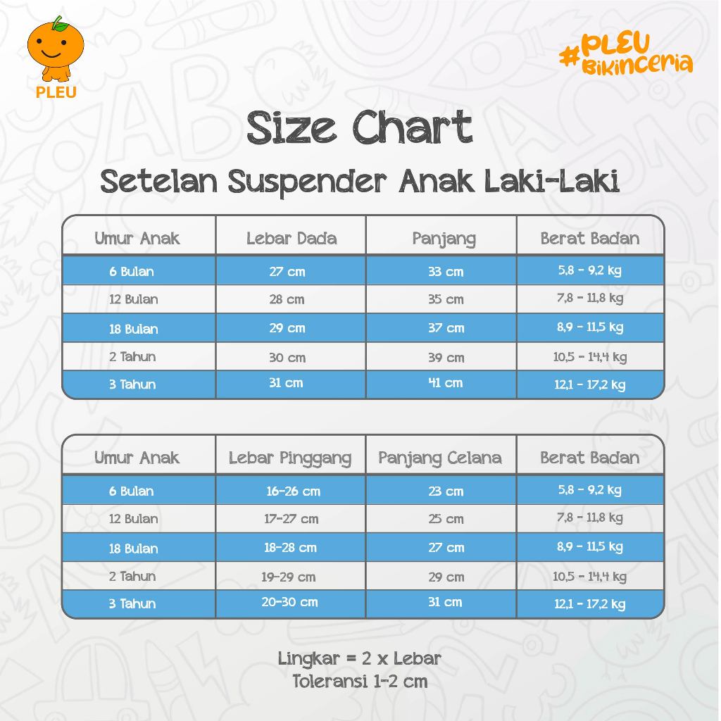 ● 12 bulan : Lebar Dada 28 cm, Panjang 35 cm, Lebar Pinggang 17-27 cm, Panjang Celana 25 cm, Berat Badan 7,8-11,8 kg