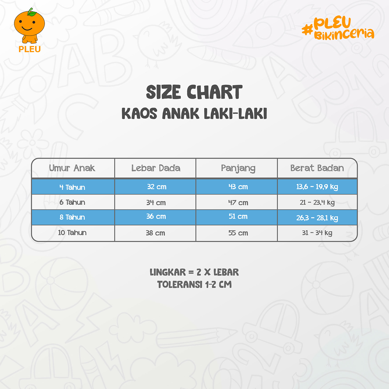 – Ukuran : 4 tahun, 6 tahun, 8 tahun, dan 10 tahun