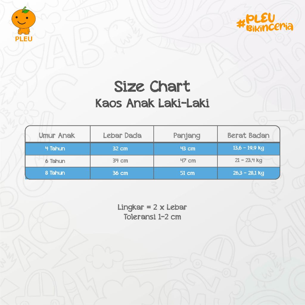 – Ukuran : 4 Tahun, 6 Tahun, 8 Tahun